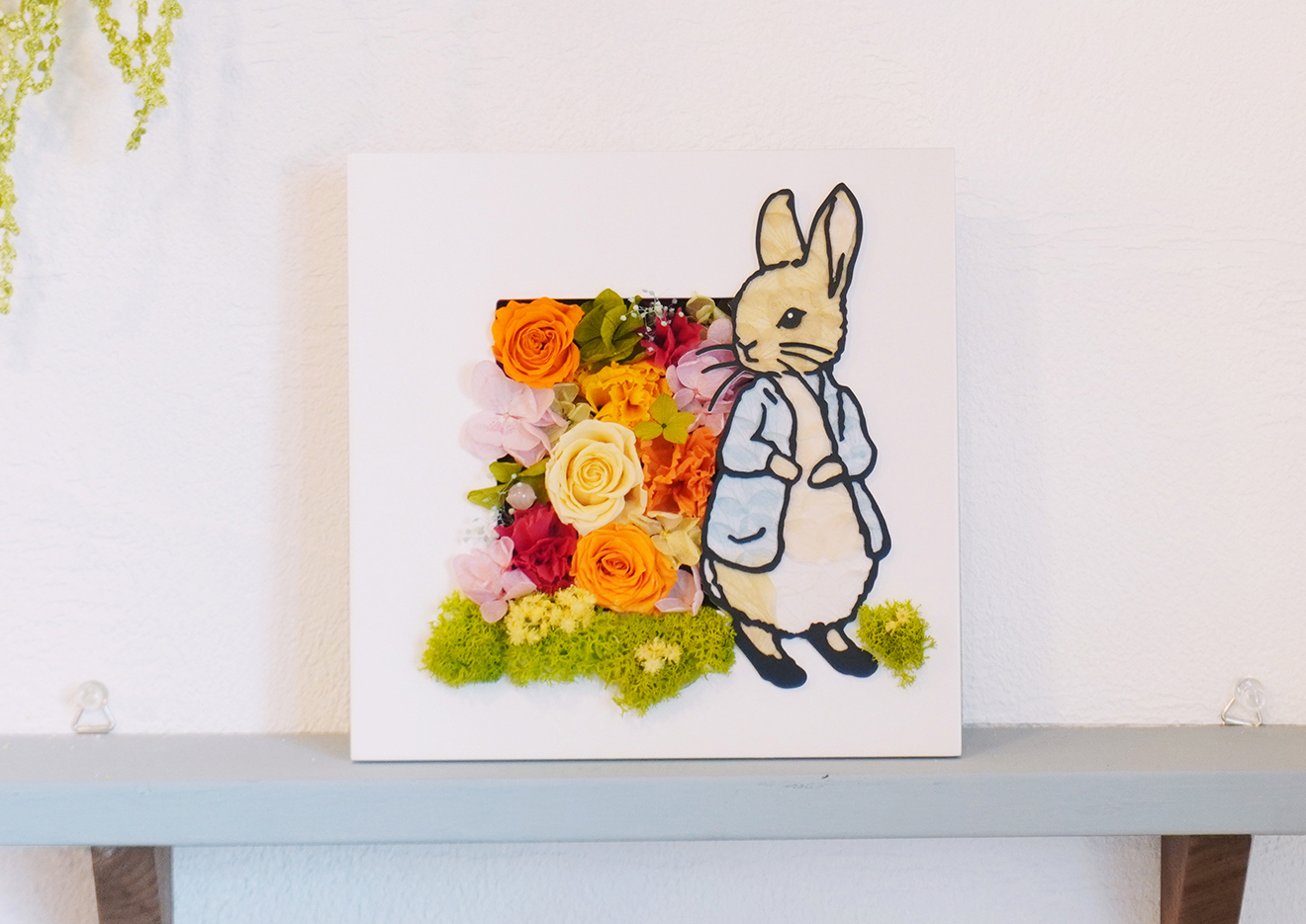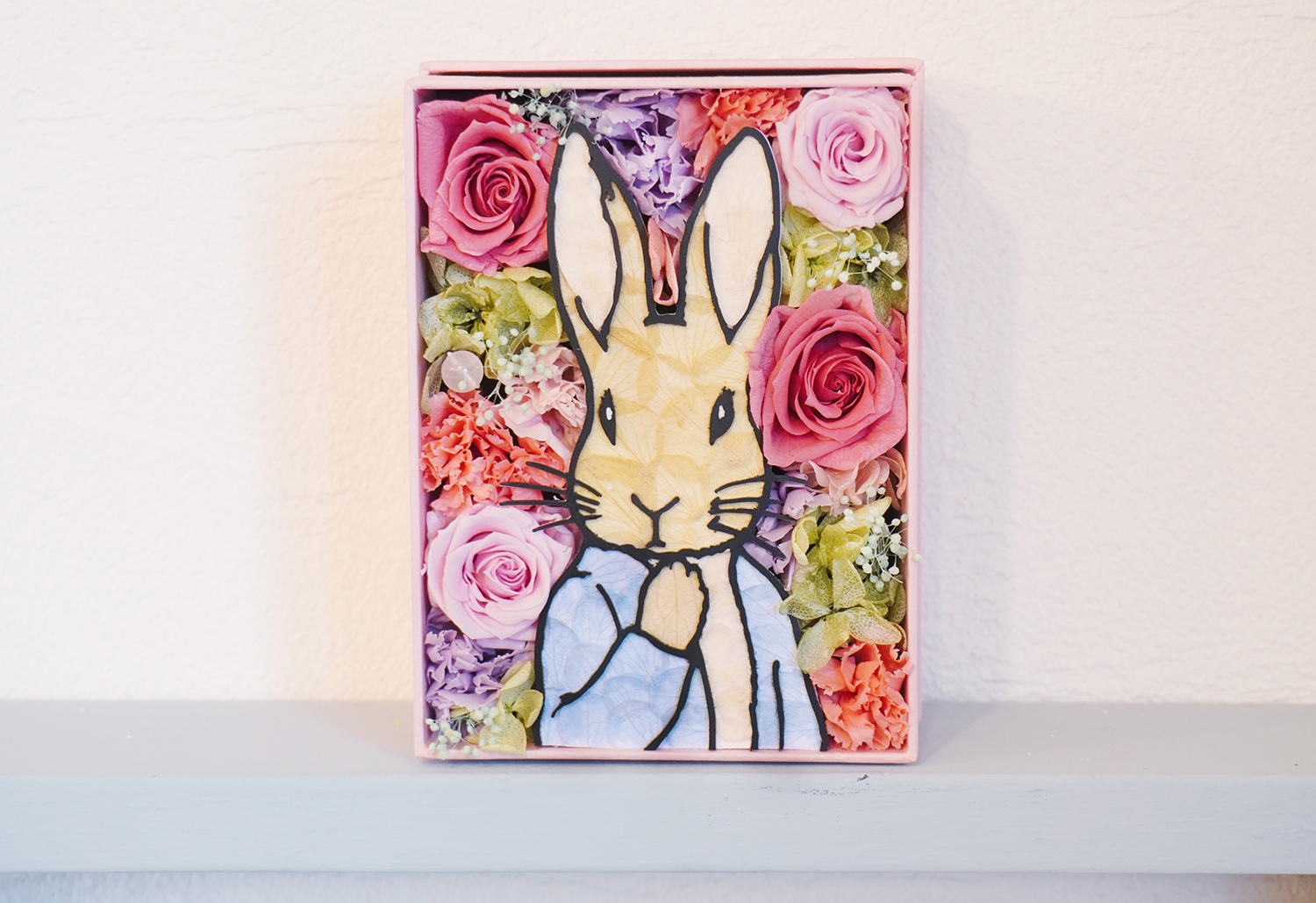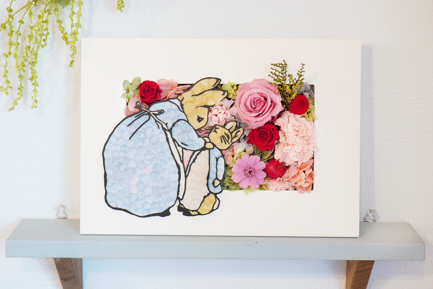 「ピーターラビット™キャラクターフラワー」シリーズは、世界的に有名な青い服を着たいたずら好きなうさぎ・ピーターラビットのおなじみの絵柄を表現したプリザーブドフラワーアートとなる。デザインは、3種類。