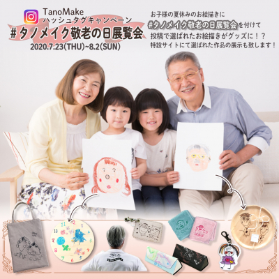 お子様が描いた絵に「#タノメイク敬老の日展覧会」 のハッシュタグを付けてインスタグラムに投稿しコンテストに応募する「夏休みお絵描きコンテスト」を2020年7月23日(木)~8月2日(日)の期間に実施いたします。コンテストに応募した方の中から20名の受賞者を決定いたします。受賞者の皆様にはTanoMake(タノメイク)内のお絵描きオーダーメイド商品をプレゼントいたします。出来上がったオーダーメイド商品は、TanoMake(タノメイク)内特設ページにて展覧いたします。