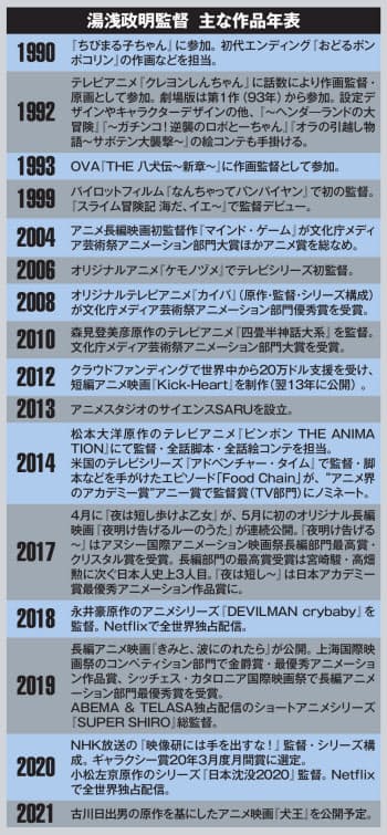 小松左京のベストセラー小説が原作で、Netflixが全世界独占配信中のアニメ『日本沈没2020』を手掛けるのが、現代を代表するアニメーション監督・湯浅政明。ここ数年は特に多作で、今年1月期放送のテレビアニメ『映像研には手を出すな!』も大反響を呼んだ。これまでの道のりとアニメへの思いを聞いた。