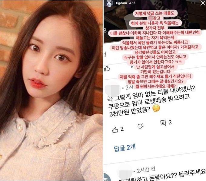 육지담은 지난 16일 자신의 인스타그램을 통해 '꼭 그렇게 엄마 없는 티를 내야겠냐. 엄마 로켓배송 받으려고 3000만원 받았음?'이라는 악성 댓글을 공개했다.